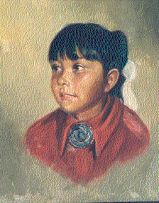 - A head and shoulder portrait of a young Navajo girl. Her hair is pulled back in a chongo, which is the traditional Navajo hairstyle, and she is wearing a red blouse with a large turquoise-and-silver broach at the collar. She is facing the viewer and is looking to the left.