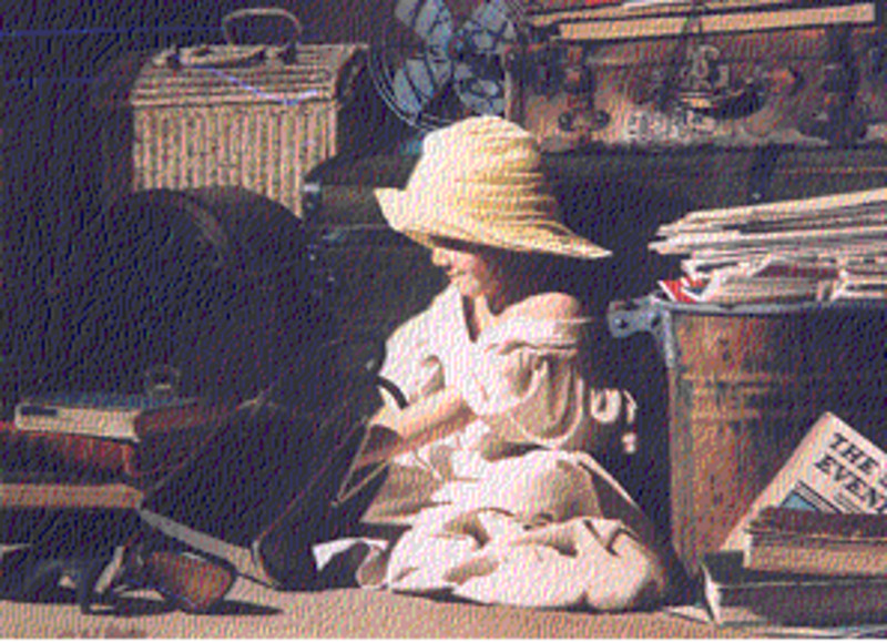 - A painting of a little girl sitting on the floor in the middle of trunks, an old radio, a copper tub full of magazines, a suitcase, an antique electric fan, a wicker trunk and stacks of books. She is wearing a hat and dress that are too big for her and she is going through a black purse that is on the floor in front of her. She is sitting in the center at the bottom of the painting and is facing left. A pair of high heels is lying on the floor in front of the purse.