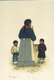 - A painting of a woman with her back to the viewer, grinding something in a log mortar with a wooden pestle. A little boy is standing on the left, and a little girl is standing on the right. Both children are facing the viewer.