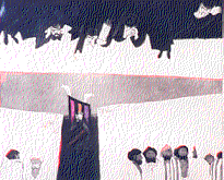 - An etching of a figure upside down in a black hole. The only parts of him that extend above the hole are his tied hands, his feet and the hem of his multicolored garment. Below this figure, along the bottom edge of the etching, there are nine men standing on both sides of the bottom of the hole, two to the left and seven to the right. At the top of the etching, above the hole, there are four men dressed in black who seem to be observing what is going on below. One of the men holds a torah.