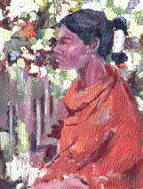 - An impressionistic portrait of a Navajo woman who appears to be seated in a garden. She is wearing her hair in the traditional wrapped style at the back of her head. She is wrapped in an orange shawl and is facing left. There are flowers and leaves in the background.