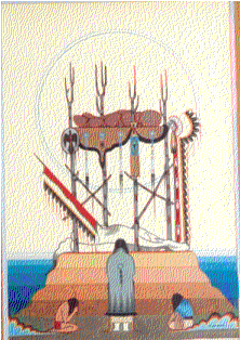 - A painting of a Plains Native American scaffold burial. The scaffold is in the center of the painting and is on a raised area. Hanging from the scaffold are a feathered war bonnet, a shield and a pipe bag. At the base of the raised area are three figures. In the center is a woman wrapped in a blanket and standing with her back to the viewer. On the left is a boy, and on the right is a girl. Both are kneeling and facing the woman.
