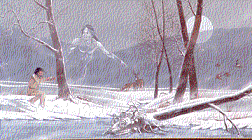 - A painting of a man with a bow about to shoot a buck that is standing in a meadow in the middle of a snowstorm. The hunter, dressed in buckskin, is crouching behind a tree on the left as he nocks an arrow. In the center of the painting, a buck with a four-by-four rack is looking toward the viewer while a doe standing beside him looks for food in the snow. In the sky above and to the right of the hunter, there is a spirit figure that is pointing toward the deer. On the right, four ducks are taking flight.