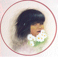 - A painting of the face of a young black-haired brown-eyed girl. She is facing slightly to the right. Her bangs almost cover her eyes and her chin is buried in a bunch of daisies.