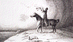 - A drawing of a man on a horse that is standing on a snowy hillside. The man is holding up a peace pipe toward the sky with the mouthpiece pointed upward. The horse's head is raised and its breath is visible in the cold air. Smoke from the man's mouth and the pipe is rising to the sky. There is a small rabbit watching in the foreground.