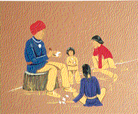 - A painting of a man sitting on a stump as he breaks a flake out of a piece of flint. He is facing right. Two young boys and a toddler are watching him. The toddler is standing by the man's left knee, a young man in a purple shirt is sitting in front of him and a young man in a red shirt is sitting beyond the toddler to the right. Four arrow points are lying on the ground in front of the man's right foot.