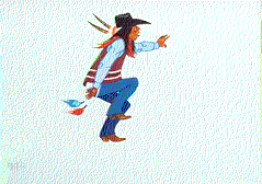 - A painting of a man dancing toward the right. His mouth is open as though he is singing and his arms are swinging. He is wearing a black cowboy hat with two feathers attached to the hatband, a red neck scarf, a blue shirt, a maroon vest, a belt with long tassels hanging down, blue jeans and cowboy boots. This painting is done on blue Crescent mat board.