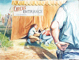- A painting of three boys trying to sneak into a circus by going under a circus tent. A policeman has caught them in the act. The boys are crouched and facing toward the right as they lift the edge of the tent. Two of the boys are looking at the policeman. The man has his back to the viewer and is on the right side of the painting. He is standing with his hands on his hips and only the right half of him, from waist to torso, is visible.