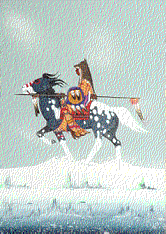 - A painting of a Plains Native American warrior riding a horse in a snowstorm. The horse and rider are moving toward the left. The warrior is wearing a wolf headdress, a buckskin suit and moccasins. He is carrying a shield and a spear in his left hand. The spear is carried horizontally, tip forward. The horse is a gray-and-white paint with red circles painted around his eyes and red bars painted across his nose.