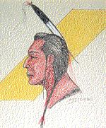 - A drawing of the head and neck of a man wearing braids and a feather attached to the back of his head. He is facing left. Behind his head there is a wide yellow diagonal stripe that is drawn from the bottom left corner to the upper right corner.