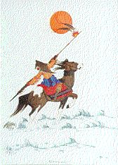 - A painting of a Plains Native American warrior wearing a wolf headdress and riding a brown paint horse. The horse appears alarmed and is moving to the right. The man, who is holding a decorated spear pointed toward the ground on the left, is turning over his left shoulder and looking down over the horse's rear at a rabbit that is running toward the left.