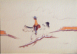- A painting of a man in a gray wide-brimmed hat riding a black-and-white spotted horse down a snow-covered slope. In the distance, there are snow-topped mesas. He is wearing an orange shirt and blue pants and his hair is tied back in the traditional style: a chongo.