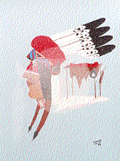 - A painting of a Plains Native American man's face and a scaffold burial. The man is wearing a war bonnet and is facing left. The face is on the left with the image of a scaffold burial on the right. A spatter-painted circle and feather are superimposed over the image.