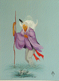 - A painting of a white-haired man who is facing the viewer. He is standing hunched over with his knees bent. He is holding a walking stick in his right hand and he is holding a lavender-colored blanket around his shoulders with his left hand. He is looking at a buffalo skull that is sitting in the grass in front of him and the image of a white buffalo head is floating in the air behind his head. "Remembering the Past" is printed at the bottom of the painting.