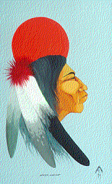 - A portrait of the face of a Native American man facing right. Behind his head, there is an orange circle and three long feathers are hanging down from the back of his head. Printed at the bottom of the painting are the words "Creek Warrior."
