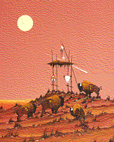 - A painting of a scaffold burial on a hill with four buffalo standing around it. A spear decorated with a beaded bag and two feathers is leaning against the scaffold on the right. A buffalo skull and a shield are hanging from two of the other supports. There is a gold moon in the sky in the upper left. A falling star is streaking across the sky behind the platform. This painting was done on red Crescent mat board.
