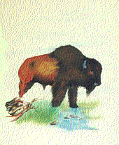 - A painting of a buffalo standing with his front hooves in a stream. He is facing right.