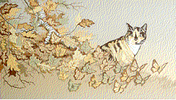 - A silkscreen of an autumn scene with an alert calico cat facing right with its head turned toward viewer watching butterflies. To the left of the cat there is the branch of an oak tree with the leaves falling off and blowing to the right. From left to right, the leaves gradually take the form of a butterfly. On the far right there are six butterflies. The artist describes this as the "permutation" of one image turning into another.