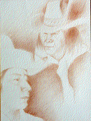 - A drawing of the faces of two men wearing cowboy hats. The man in the upper right is facing slightly to the viewer's left. The man in the lower left is facing the viewer's right.