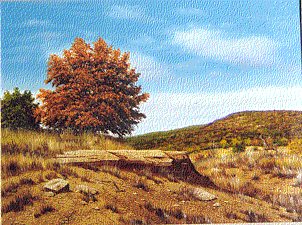 - A painting of a landscape with a 10-point buck on the right. Above and to the left of the buck is a large tree covered with orange leaves. The tree is on a bench behind a rock outcrop. In the lower left, a quail sits on a rock.
