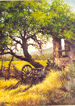 - A painting of a wooden-wheeled piece of farm equipment, possibly a wagon, resting in the grass by the corner of an old stone building. An old tree spreads its branches over it. A prickly pear cactus is located by the right wheel, and a yucca plant is in the lower right.
