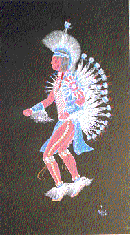 - A painting of a powwow fancy war dancer against a black background. The dancer is facing left. He is wearing a feather rocker headdress, upper- and lower-back feather bustles and feathered arm bands. He is also wearing a blue vest and a blue breechclout, blue gauntlets on both arms and moccasins. He has bands of bells on both legs.