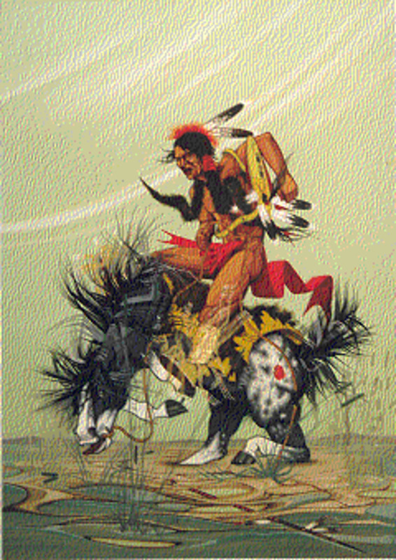 - A painting of a Native American man riding a frightened gray horse that is frantically lunging or bucking in an attempt to escape a bog. The horse's right rear leg is stuck in the mud. The Native American man is struggling to stay on the horse. His hair is braided, and he is wearing a red breechclout and moccasins. A shield hangs across his chest. He is using a buffalo hide as a saddle. A spear lies in the mud, almost under the horse's feet.
